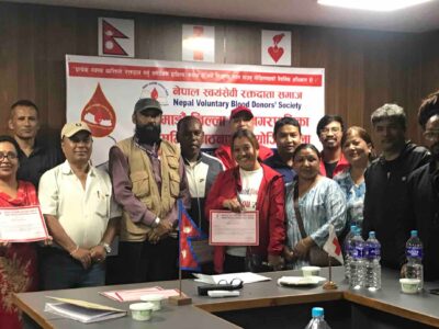 काठमाडौं, असोज । रगत आपूर्ति र बितरणमा भईरहेको बेमेललाई न्यूनीकरण गर्न नेपाल स्वयंसेवी रक्तदाता समाजले रक्तदान गर्न÷गराउन गरिएको आह्वानलाई सार्थक तुल्याउँदै गोदावरी नगरपालिका अन्तर्गत वडा नम्बर १४ स्थित लाक्षी टोलमा एक बिशेष सम्मान तथा रक्तदान कार्यक्रम एवं ५ किलोमिटर सडक दौड प्रतियोगिताको समेत आयोजना गरि दशैंको उपलक्ष्यमा शुभकामना आदानप्रदान गरि समापन गरिएको छ ।