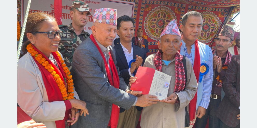 काभ्रेपलाञ्चोक, ४ भदौः काभ्रेपलाञ्चोकको भुम्लु गाउँपालिकाको दुई वडाबासीले ५० वर्षपछि आफ्नो जग्गाको लालपूर्जा पाएका छन् । भूमि व्यवस्था, सहकारी तथा गरिबी निवारणमन्त्री बलराम अधिकारीले मङ्गलबार लालपूर्जा वितरण सुरु गर्नुभएको हो ।