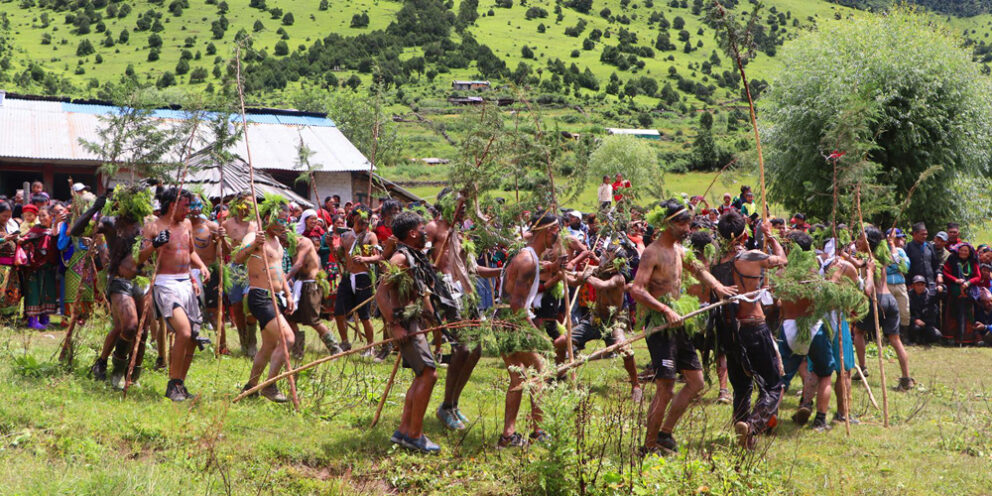 ढोरपाटन (बागलुङ), ४ भदौ : अर्ध नग्न शरीर, मोसोले छोपिएको अनुहार र छाति, कम्मरमा सेतो कपडा बाँधेर हातमा धुपीको हाँगो समातेर केही युवा दौडिँदै थिए । ती युवाका पछि ढ्याङ्ग्रो ठट्याउँदै आइरहेका थिए, झाँक्रीहरु । माथिदेखि दौडिँदै आएको झाँक्री र एक हुल युवाको दृश्य अनौठो थियो । यो अवसरको साक्षी बन्न निसेलढोरमा सयौँ मानिस जम्मा भएका थिए ।