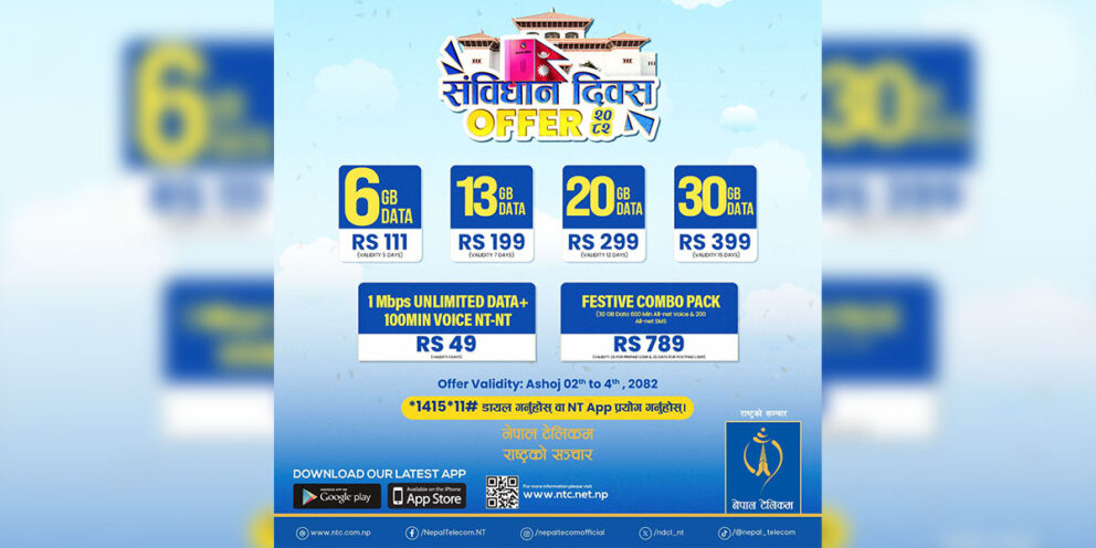 काठमाडौँ, २ असोजः संविधान दिवसका अवसरमा नेपाल टेलिकमले विशेष ‘अफर’ घोषणा गरेको छ । नेपालको संविधान २०७२ घोषणाको एक दशक पूरा भएको उपलक्ष्यमा टेलिकमले आफ्ना ग्राहकहरुका लागि ‘संविधान दिवस अफर २०८२’ उपलब्ध गराइने जनाएको छ ।