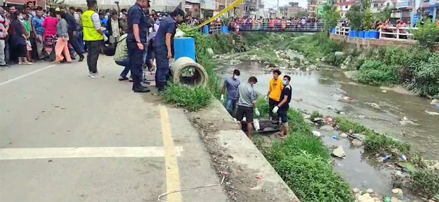 काठमाडौँ, १८ मङ्सिरः धोबी खोलामा साइकलसहित एउटा शव भटिएको छ । जिल्ला प्रहरी परिसरका प्रहरी उपरीक्षक पवनकुमार भट्टराईका अनुसार आज बिहान काठमाडौँ महानगरपालिका–२९ रुद्रमति पुल नजिक धोबी खोलामा साइकलसहित शव भेटिएको हो ।