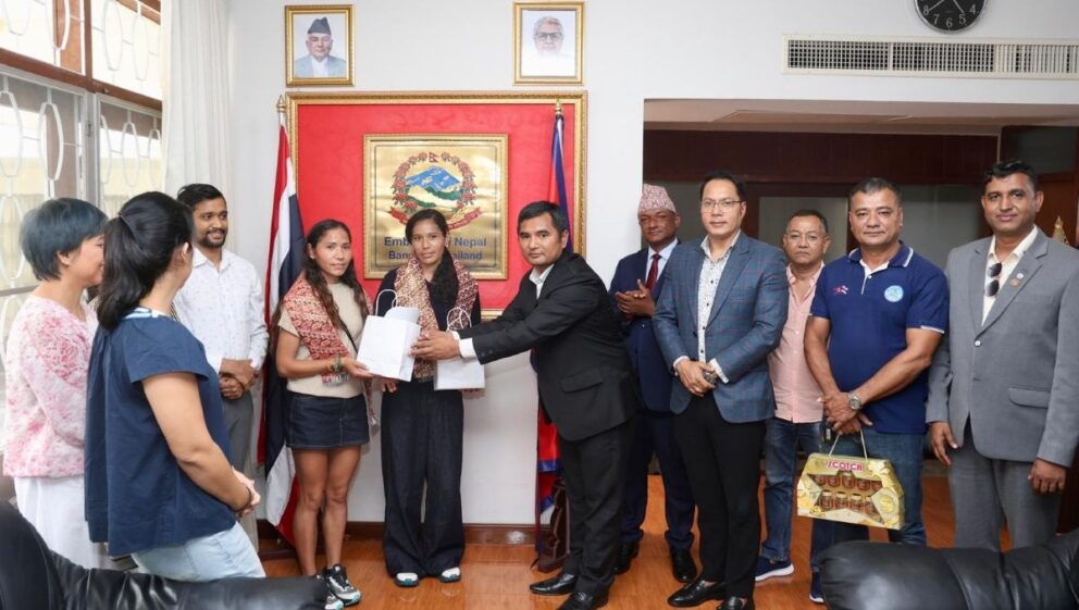 काठमाडौँ, २८ मङ्सिरः थाइल्याण्डको प्रसिद्ध पर्यटकीय तथा साहसिक खेलकुद गन्तव्य च्याङ्गमाईमा गत साता आयोजित विश्वप्रसिद्ध अन्तरराष्ट्रिय ट्रेल रन प्रतियोगितामा उल्लेखनीय सफलता हासिल गरेका नेपाली धावकद्वय सनमाया बुढा र रनमाया बुढालाई नेपाली राजदूतावास बैङ्ककले सम्मान गरेको छ ।