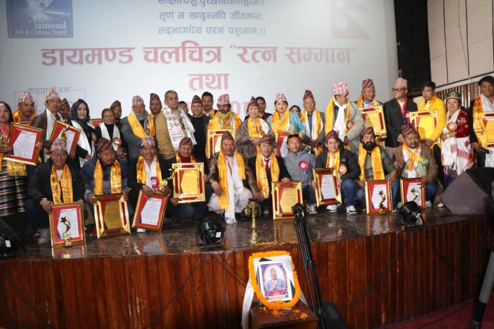काठमाडौं २९ माघ । डायमण्ड आर्ट एण्ड कल्चर नेपालको आयोजनामा ‘डायमण्ड फिल्मस् रत्न सममान तथा अवार्ड २०८२’ चलचित्र बिकास बार्डको सभाहलमा बिभिन्न क्षेत्रमा योगदान पुराउनु हुने श्रष्टा, सर्जक तथा व्यक्तित्वहरुलाई रत्न सम्मान तथा अवार्ड प्रदान गर्दै सम्पन्न भएको छ ।