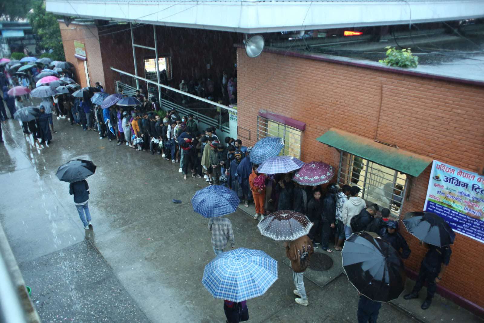 दसैँको अग्रिम टिकट बुकिङ खुला, छाता ओढेर टिकट काट्दै यात्रु