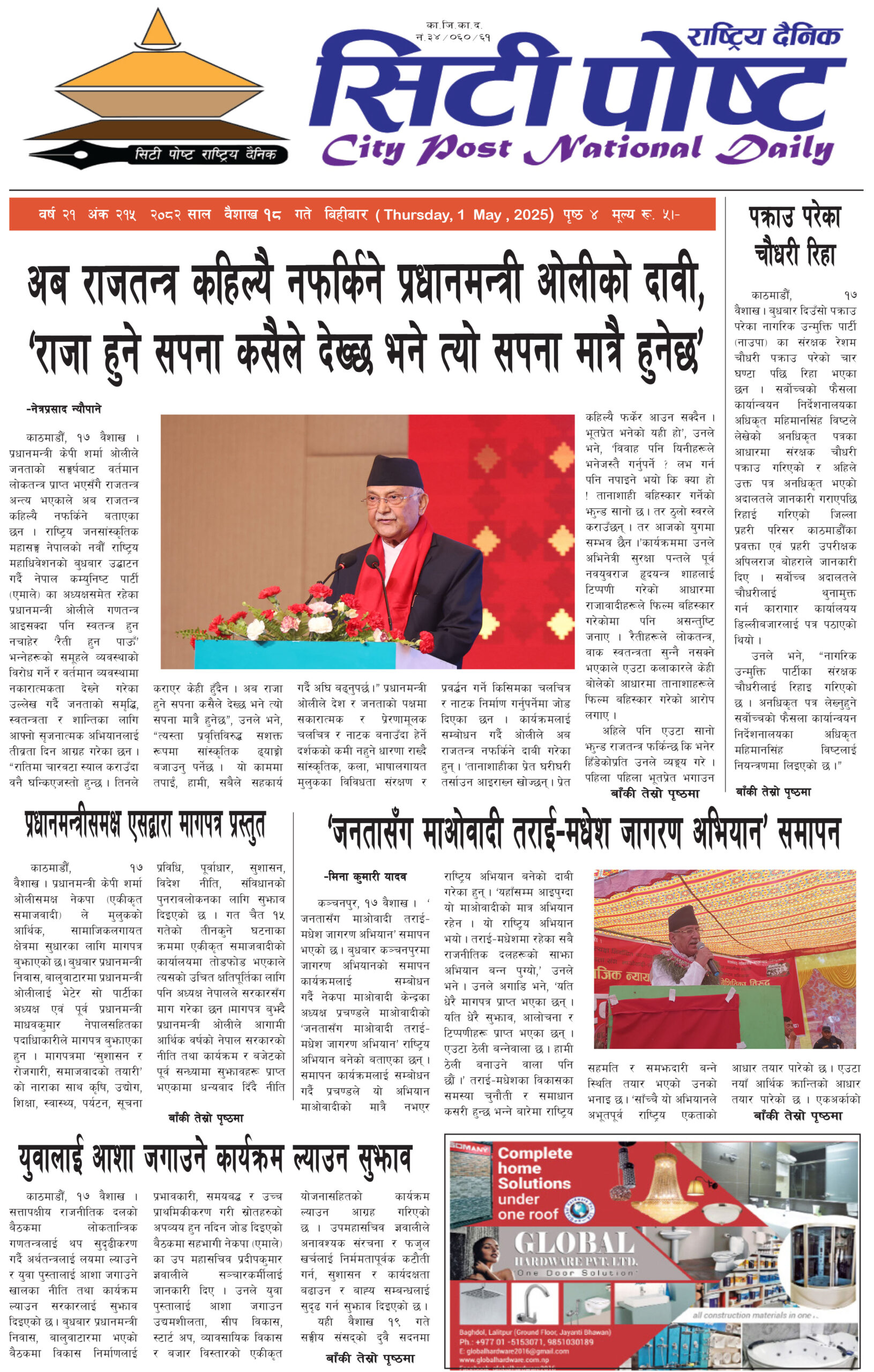 सिटीपोष्ट राष्ट्रिय दैनिक २०८२ वैशाख १८